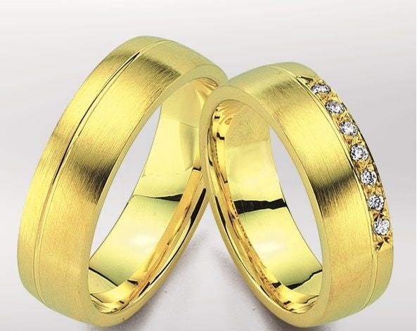 Ein wundervoller Anblick entpuppt sich bei Betrachtung dieser Eheringe aus dem Hause Adam & Eva Collection stammend. Die 6.0 mm breite Ringe aus Gelbgold in 3 verschiedenen Legierungen erzeugt. Kaum zu überbieten ist Art des Damenrings. Der mit einem seitlichen Kana bestehende Ring verfügt über 7 eingebettete Brillanten. Die Ringe sind auch einzeln oder ohne Brillanten bestellbar. Bitte senden Sie uns bei Fragen eine Email.Eigenschaften: