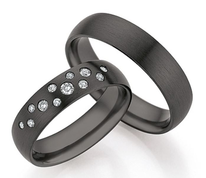 Trauringe aus Zirkonium in 5.5 mm breite. Der Damenring ist mit 12 echten Diamanten verziert.