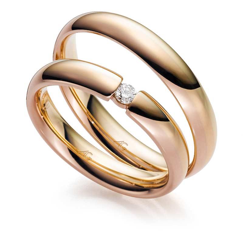 Der wunderschöne Farbverlauf der Eheringe vom Rotgold zum Gelbgold ist einmalig. Das komplizierte Verfahren beherrschen die Kunsthandwerker des Hauses Gerstner perfekt. Die 4 mm breiten Trauringe mit der matten Oberfläche begeistern. Wundervoll ist bei dem Ring der Braut ein feuriger Brillant platziert. In der dafür herausgearbeiteten Öffnung kommt er traumhaft zur Geltung. Die Ringe sind auch einzeln oder ohne Brillanten bestellbar. Bitte senden Sie uns hierfür eine Email.