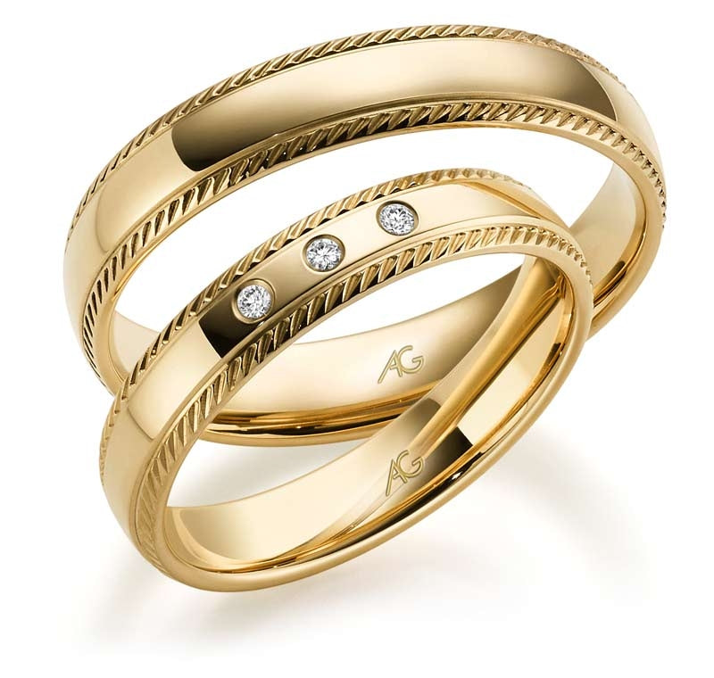 Eigenschaften:Ruhe und Harmonie geht von diesen 4 mm und 4.5 mm breiten Eheringen der Trauringschmiede Gerstner aus. Die polierten, hier in Gelbgold abgebildeten, Schmuckstücke haben weich geformte Kanten und eine gewölbte Oberfläche. Beidseitig dekorieren schmale Randstreifen die Ringe. In diese Randstreifen sind nebeneinander und umlaufend schräg kleine, Tropfenförmige sowie matte, Kerben eingefräst. Die wunderbare Optik dieses Ringpaars rundet der Brautring Ihrer besseren Hälfte ab. Mitten in den Ringrücken, zwischen die beiden Randstreifen, sind mit einem kleinen Abstand drei strahlende Brillanten eingerieben. Die wertvollen Steine haben insgesamt 0,03 Karat.