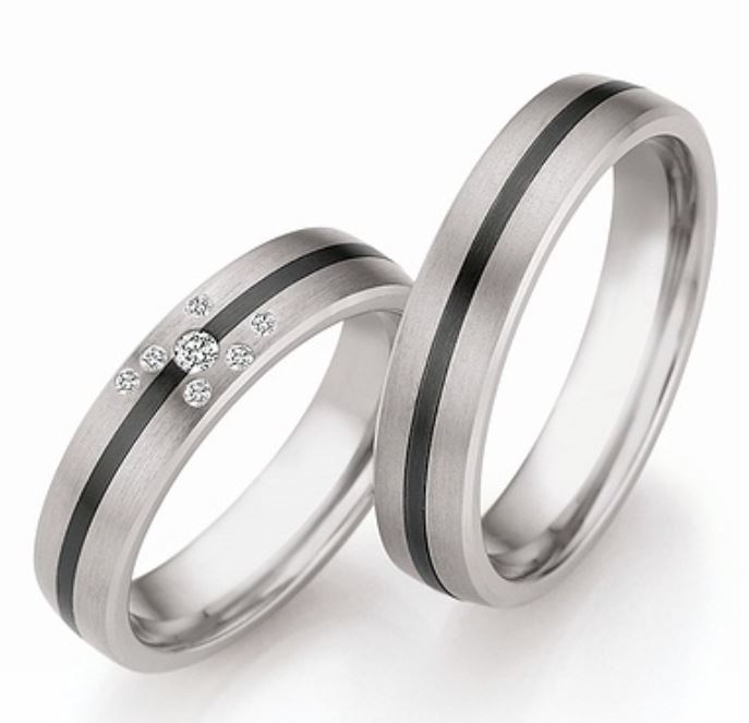 Stilvoll umrunden drei unterschiedlich breite Bahnen den fabelhaften Korpus dieser 5 mm breiten Bicolor Eheringe aus den Ateliers des Hauses Nowotny Collection Ruesch. Aus schwarzem, mattierten, Zirkonium ist die mittlere, etwas schmalere, Bahn die sich in zwei langgezogenen und gegenläufigen Schrägen um den Korpus herum bewegt. Aus matten Weißgold sind die beiden außenliegenden Bahnen bei den hier abgebildeten Schmuckstücken. Klassisch ist der Querschnitt mit weich gezeichneten Flanken und einer leicht konvexen Oberfläche. Feine Rillen rahmen die schwarze Bahn ein. Bei dem Brautring Ihrer Zukünftigen wird die schwarze Bahn für zirka 10 mm unterbrochen. Diese Unterbrechung schafft Platz für fünf blitzende Brillanten. Die attraktiven Steine haben insgesamt 0,075 Karat.