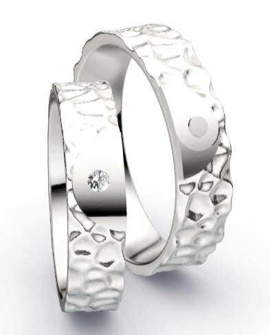 Nowotny Collection Ruesch Signs of Love 66/51090-66/51100 sind hochwertige Trauringe aus Silber, Gelbgold, Weißgold aus dem Hause Collection Ruesch. Die Ringe haben eine angenehme Breite von ca. 5,0mm. Der Damenring ist mit einem Brillanten besetzt, die zusammen etwa 0,015ct ergeben.