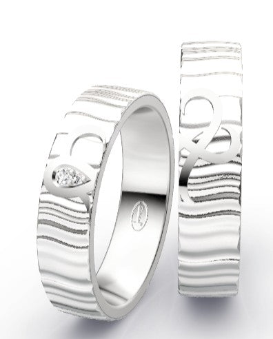 Nowotny Collection Ruesch Signs of Love 66/51090-66/51100 sind hochwertige Trauringe aus Silber, Gelbgold, Weißgold aus dem Hause Collection Ruesch. Die Ringe haben eine angenehme Breite von ca. 5,0 mm. Der Damenring ist mit einem Brillanten besetzt, die zusammen etwa 0,025ct ergeben.
