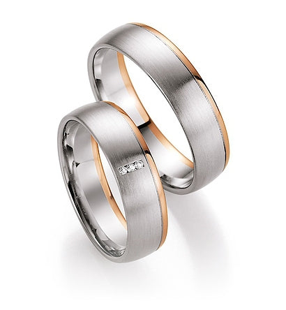 Eine Augenweide sind diese Bicolor Eheringe von den Designern der Trauringmanufaktur Brüder Nowotny in Wien. Auf 5.5 mm Breite haben die kreativen Kunsthandwerker ein elegantes und zeitloses Ringpaar gestaltet. Die leicht gewölbte Oberfläche spannt sich sanft über die Ringbreite. Der größte Teil des Rückens ist aus mattiertem Weißgold. In unmittelbarer Randnähe ist bei den Schmuckstücken aus der "Heaven Number Seven" Kollektion eine filigrane Naht, die den Körper umrundet. Jenseits der Naht wird der Rand aus glänzendem Rotgold geformt. Wundervolle Ringe für eine fantastische Zukunft. Strahlen, wie Brillant/en wird Ihre zukünftige Ehefrau bei dem Anblick ihres Brautrings. In die Weißgoldene Bahn ist quer ein kleines Rechteck eingearbeitet. Perfekt passen drei funkelnde, insgesamt 0,015 karätige, herrliche Steine da hinein. Die Ringe sind auch einzeln oder ohne Brillanten bestellbar. Bitte senden Sie uns bei Fragen eine Email.