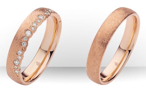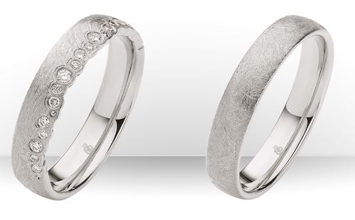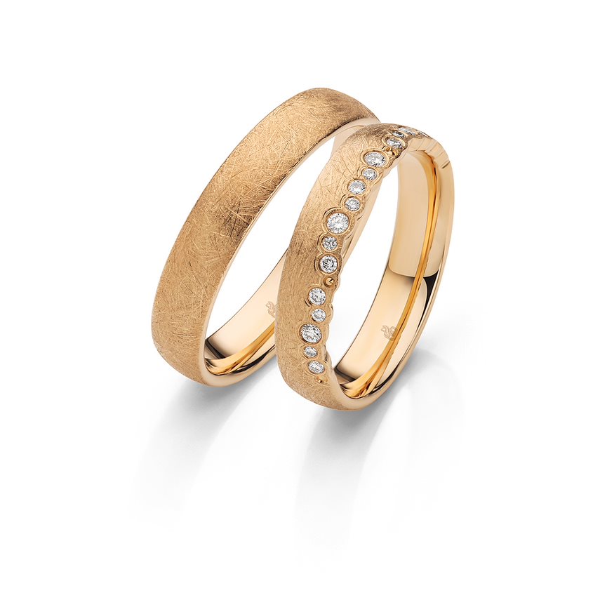 Eigenschaften:Aus der Rauschmayer Kollektion sind diese feinen Trauringe entstanden, Die Ringe werden in mehreren Legierungen angeboten. Der Damenring hat 19 Brillanten die seitlich mit großer Liebe eingerieben sind.