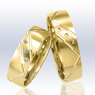 Zackig ist der Auftritt dieser interessanten 6 mm breiten Eheringe die Sie hier in Gelbgold abgebildet sehen. Die kreativen Kunsthandwerker der Trauringmanufaktur Rauschmayer haben diesen Ringen eine nahezu plane Oberfläche mit gerade abfallenden Flanken gegeben. Der breite Ringrücken schimmert wunderbar durch die feine Mattierung. Geschmückt werden die Kleinode durch glänzend polierte Nuten. Sie beginnen und enden mit zwei schräg, im Abstand von zirka 3 mm, von Kante zu Kante parallel verlaufenden Nuten von denen das zickzackförmige Muster ausgeht. In dem Freiraum zwischen den beiden schräg verlaufenden Linien sind drei effektvolle Bohrungen platziert. Bei dem Ring Ihrer Herzdame sich in diese Bohrungen drei strahlende, insgesamt 0,03 karätige Brillanten eingerieben. Die Ringe können auch einzeln oder ohne Brillanten bestellt werden. Bitte senden Sie uns bei Fragen eine Email.