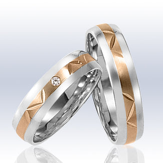 In der Ruhe liegt die Kraft dieser attraktiven, hier in Weißgold und Rotgold abgebildeten, 5 mm breiten Bicolor Eheringe aus dem Pforzheimer Trauringschmiede Rauschmayer. Im Zentrum der Preziosen mit dem weißen Fundament ist ein etwa 2 mm breiter und farbiger Goldstreifen eingelassen. Der gesamte Ringrücken schimmert wundervoll durch die feine Längsmattierung. Verziert wird das Ringpaar durch eine umlaufende zickzackförmige, Anordnung von drei "Weberschiffchen - ähnlichen" Ornamenten. Die herausgefrästen Flächen sind hochglanzpoliert. Das i-Tüpfelchen des Ringpaars und somit der gelungene Abschluss der Kleinode erfolgt durch den feurigen Brillant auf dem Brautring Ihrer Herzdame. Der eingesetzte Edelstein hat ein Gewicht von 0,02 Karat.