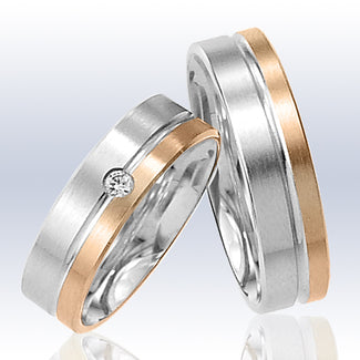 Die klare Formensprache der 6 mm breiten Bicolor Ehringe, hier in Weißgold und Rotgold abgebildet, aus der Trauringmanufaktur Rauschmayer macht sie zum Eyecatcher. Die Kunsthandwerker haben bei diesen Preziosen auf eine asymmetrische Aufteilung gesetzt. Der weiße Body dieser Trauringe hat nach dem Mittelpunkt eine imposante, umlaufende und hochglanzpolierte, Vertiefung bekommen. Die zum Rand hin verbleibende Fläche ist aus farbigen Gold. Durch die Strichmattierung schimmert die gesamte Ringstärke: Bei dem Brautring Ihrer Lieblingsfrau ist in den Verlauf der Vertiefung ein strahlender 0,05 karätiger weißer Brillant eingerieben. Die Ringe können auch einzeln oder ohne Brillanten bestellt werden. Bitte senden Sie uns bei Fragen eine Email.