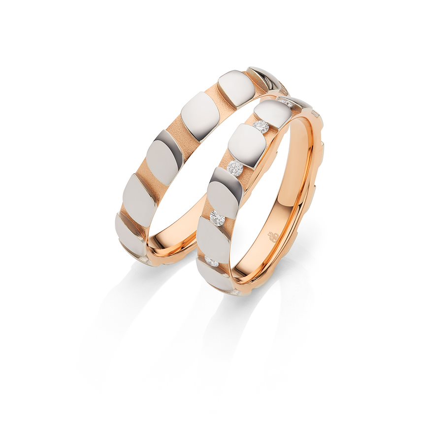 Optisch reizvolle Trauringe in 4,0 mm Breite von Rauschmayer. Die Ringe werden in Rotgold/Palladium gefertigt. Der Damenring besitzt 5 Diamanten.