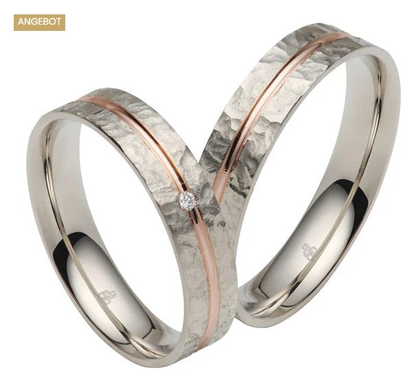 Eine tolle Oberflächenstruktur bieten dieses Ringpaar in 4.5 mm breite von Rauschmayer, aus der First Gold Serie. Der Damenring besitzt einen 0,015 ct Brillant in der Fuge eingerieben. Made in Germany. Die Ringe werden in Gold erstellt. Die Ringe sind auch einzeln oder ohne Brillanten bestellbar. Bitte senden Sie uns bei Fragen eine Email