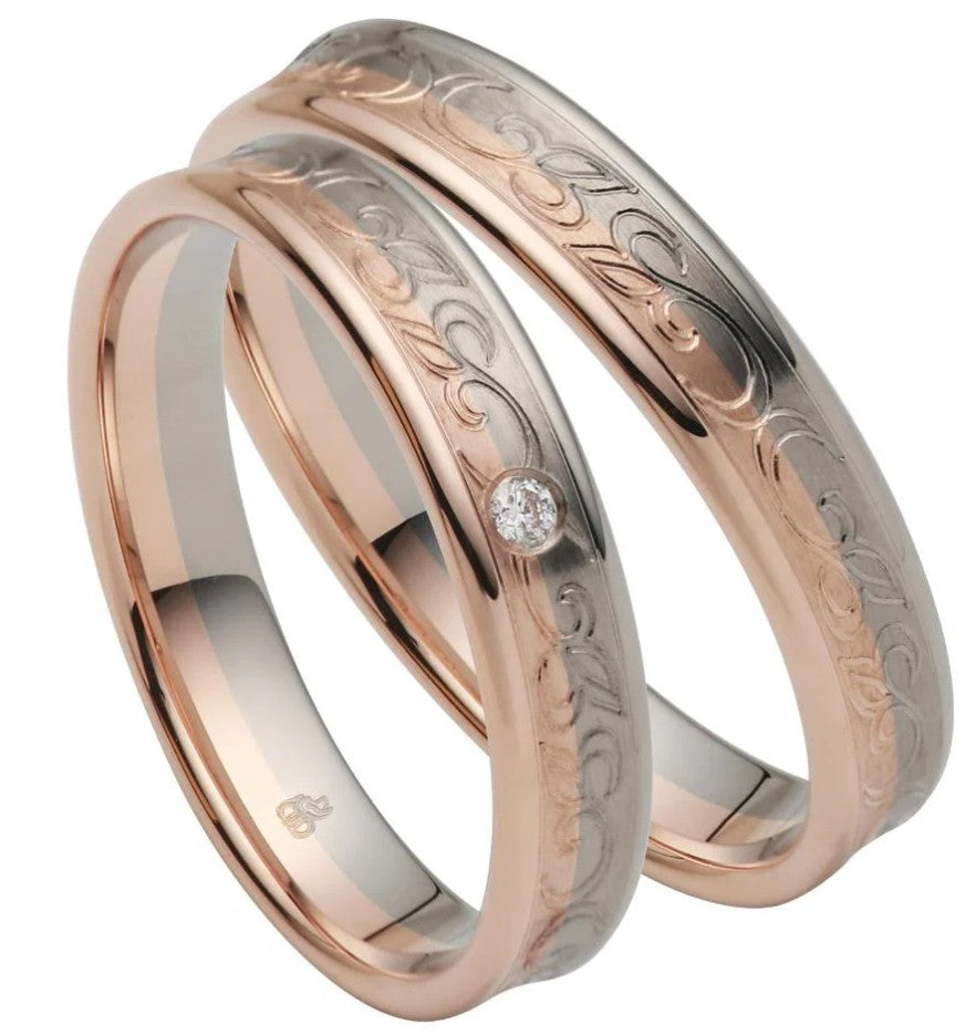 Von Rauschmayer aus der First Gold Serie ist dieses zarte mit Ornamenten strukturierte Ringpaar etwas Außergewöhnliches. Die Ringe werden aus Weiß/Rosegold erschaffen. Der Damenring besitzt zudem ein 0,020 ct. Brillant. Die Ringe sind auch einzeln oder ohne Brillanten bestellbar. Bitte senden Sie uns bei Fragen eine Email