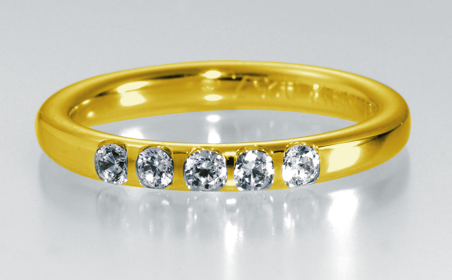 Eigenschaften:Traumhaft schöner 2,8 mm breiter Ring aus der Saint Maurice Memoire Serie. Der Ring wird aus Gelbgold oder Weißgold hergestellt. In den Legierungen 585er und 750er und mit 5 Brillanten mit ges. 0,25ct. W/SI Qualität ist dieser besetzt. Dieser Ring kann auch ohne Steine bestellt werden. Bitte senden Sie uns hierzu eine Mail.