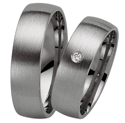 Ganz klassische 6.0 mm breite Eheringe von Schwarz Trauringe. Die Ringe werden aus Platin 600 oder 950er ausgewählt werden. Der Damenring verfügt über 1x0,03ct Brillanten. Die Ringe sind auch einzeln oder ohne Brillanten lieferbar!