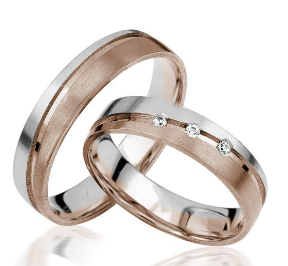 Simon & Söhne Trauringe/Eheringe AU 9 Bicolor S 928 sind hochwertige Trauringe aus Weißgold-Rotgold aus dem Hause Simon & Söhne. Die Ringe haben eine angenehme Breite von ca. 4,5mm. Der Damenring ist mit 3 Brillanten besetzt, die zusammen etwa 0,06ct ergeben.