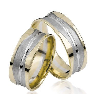 Eigenschaften:Simon & Söhne Trauringe/Eheringe Basic Bicolor S 119 sind hochwertige Trauringe aus Weißgold-Gelbgold aus dem Hause Simon & Söhne. Die Ringe haben eine angenehme Breite von ca. 7,0mm. 100% Allergiefrei. Wundervoll und auf drei Ebenen angelegt sind diese überwältigenden 7.0 mm breiten, hier in Weißgold und Gelbgold abgebildeten, Bicolor Eheringe aus der Trauringschmiede Simon & Söhne. Die Goldschmiede haben die oberste Ebene aus polierten farbigen Gold geschmiedet. Die mittlere Ebene ist aus längsmattierten Weiße Edelmetall mit einer längsmattierten Oberfläche die sich wie ein breiter Fluss gleichmäßig um den Ringkörper herumschlängelt. In der Ringmitte ist eine unterste Ebene in Form eines schmalen und umlaufenden Kanals mit polierter Innenseite ausgehoben worden. Mit diesen Trauringen haben Sie ein ausdrucksvolles Kleinod für Ihre Liebste und für sich gefunden. Die Ringe sind in Weißgold/Gelbgold, Weißgold/Rotgold, Palladium/Gelbgold, Palladium/Rotgold, Platin/Gelbgold und Platin/Rotgold erhältlich. Die Preise von Weißgold/Gelb- oder Rotgold, Palladium/Gelb- oder Rotgold und Platin/Gelb- oder Rotgold sind identisch. Die Ringe sind auch einzeln oder ohne Brillanten bestellbar. Bitte senden Sie uns bei Fragen eine Email.