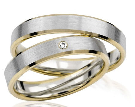 Simon & Söhne Trauringe/Eheringe Basic Bicolor S 120 sind hochwertige Trauringe aus Weißgold-Gelbgold aus dem Hause Simon & Söhne. Die Ringe haben eine angenehme Breite von ca. 4,0mm. Der Damenring ist mit einem Brillanten besetzt, die zusammen etwa 0,02ct ergeben.