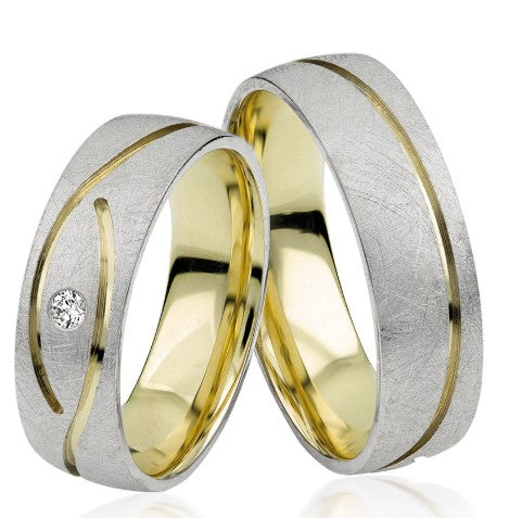 Simon & Söhne Trauringe/Eheringe Basic Bicolor S 122 sind hochwertige Trauringe aus Weißgold-Gelbgold aus dem Hause Simon & Söhne. Die Ringe haben eine angenehme Breite von ca. 6,0mm. Der Damenring ist mit einem Brillanten besetzt, die zusammen etwa 0,03ct ergeben.