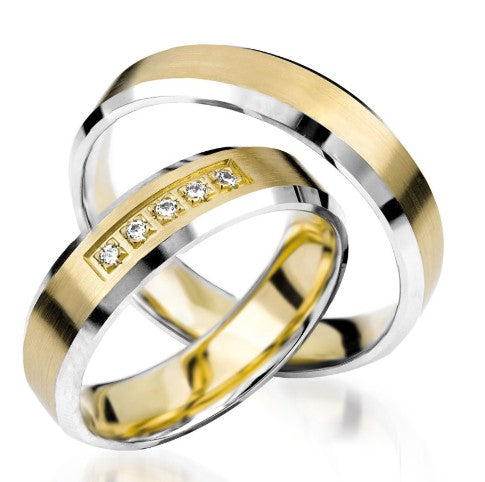 Simon & Söhne Trauringe/Eheringe Basic Bicolor S 130 sind hochwertige Trauringe aus Weißgold-Gelbgold aus dem Hause Simon & Söhne. Die Ringe haben eine angenehme Breite von ca. 5,0mm. Der Damenring ist mit 5 Brillanten besetzt, die zusammen etwa 0,05ct ergeben.