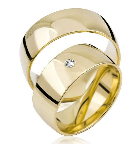 Simon & Söhne Trauringe/Eheringe Basic S 103 sind hochwertige Trauringe aus Gelbgold aus dem Hause Simon & Söhne. Die Ringe haben eine angenehme Breite von ca. 8,0mm. Der Damenring ist mit einem Brillanten besetzt, die zusammen etwa 0,04ct ergeben.