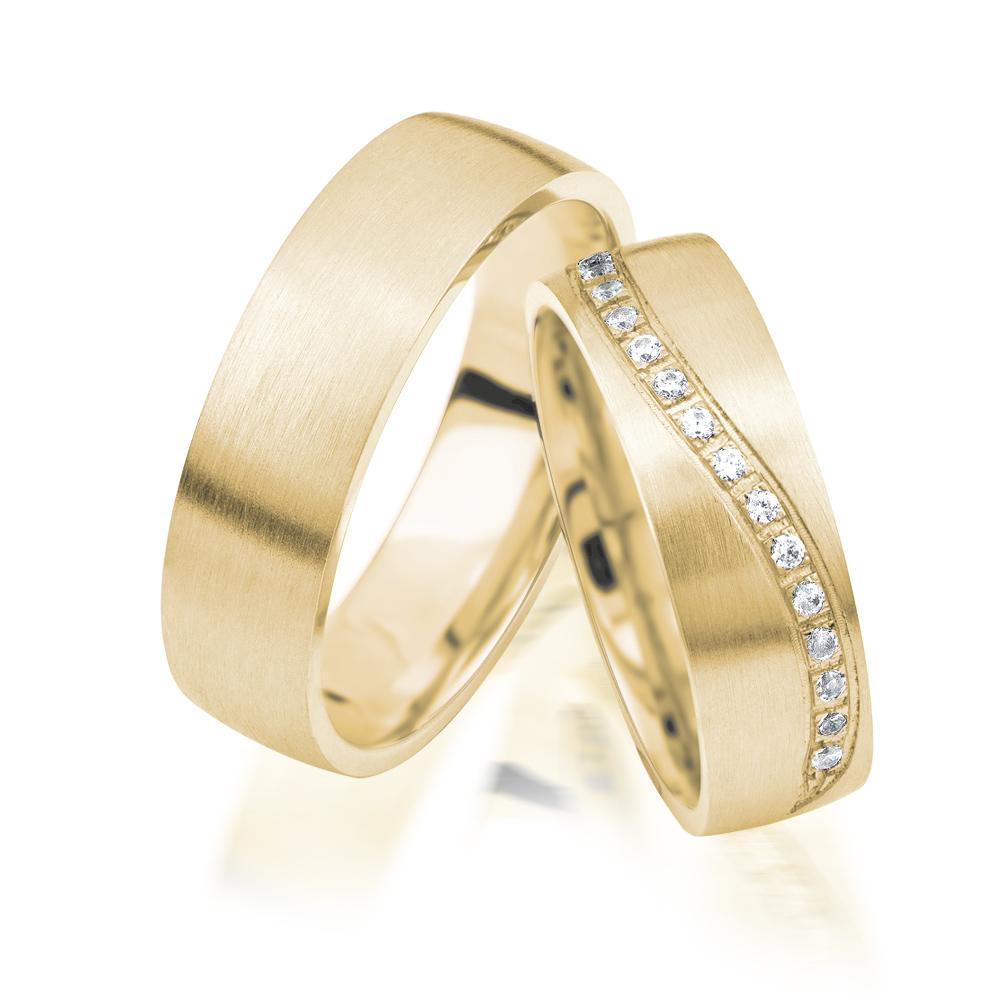 GelbgoldEigenschaften:Schlicht und schön ist der Stil dieser 6.0 mm breiten, hier in Gelbgold abgebildeten, Eheringe aus den Werkstätten der Trauringschmiede Simon & Söhne. Hochglänzend sind die beidseitigen Wangen und längsmattiert ist die leicht gewölbte Oberfläche der herrlichen Schmuckstücke. Neben dem stilvollen Ring für den Bräutigam glänzt der Trauring der Braut. Parallel angeordnet bilden zwei Fugen ein langestrecktes und schräg gestelltes "S" das am Anfang und am Ende spitz zuläuft. Die Bögen des "S" laufen dicht an dem rechten und linken Rand vorbei. Fast den halben Ringumfang umschließt dieses, aus den Fugen gezeichnetes, Schriftzeichen. Zwischen diesen Fugen, das "S" ausfüllend, haben die Edelstein Fasser 15 grandiose Brillanten eingesetzt. Die traumhaften Steine haben insgesamt 0,15 Karat. Die Ringe sind in Weißgold, Gelbgold, Rotgold, Palladium und Platin erhältlich. Die Preise von Gelbgold und Rotgold sind identisch. Die Ringe sind auch einzeln oder ohne Brillanten bestellbar. Bitte senden Sie uns bei Fragen eine Email.