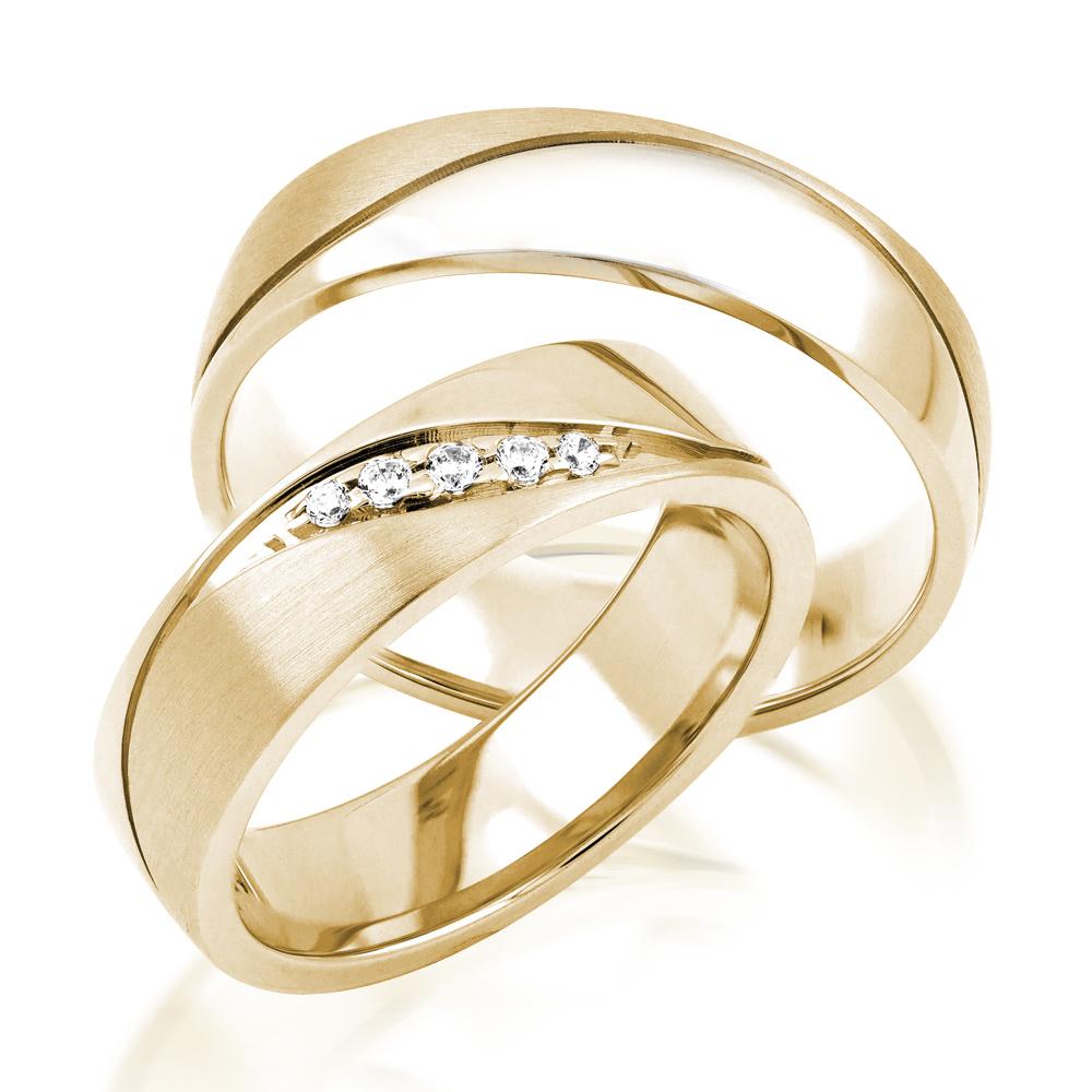 GelbgoldEigenschaften:Eine markante Nut umrundet, von Rand zu Rand, in vier Bögen diese edlen 5.5 mm breiten Eheringe der Designer des Trauringhauses Simon & Söhne. Die Glanznut trennt bei diesen, hier in Gelbgold abgebildeten, Schmuckstücken die polierte von der mattierten Ringhälfte. Bei dem schönen Brautring Ihrer Lieblingsfrau verbreitert sich die Nut, auf ihrem Weg von links nach rechts, auf einer Strecke von über 10 mm und bildet die Form eines Weberschiffchens. In diese Aussparung haben die Edelstein Fasser hintereinander fünf unterschiedlich große, insgesamt 0,09 karätige Brillanten eingepasst. Die Ringe sind in Weißgold, Gelbgold, Rotgold, Palladium und Platin erhältlich. Die Preise von Gelbgold und Rotgold sind identisch. Die Ringe sind auch einzeln oder ohne Brillanten bestellbar. Bitte senden Sie uns bei Fragen eine Email.