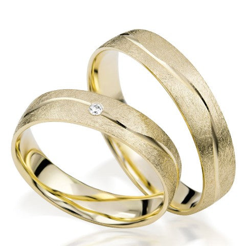 Der eismattierte Ringrücken dieser traumhaften 4.5 mm breiten, hier in Gelbgold abgebildeten, Eheringe aus der Trauringmanufaktur Simon & Söhne schimmert verführerisch. Wunderbar ist der Kontrast zu den glänzenden Wangen und der schlängelnden Glanzfurche die den Rücken durchpflügt. Die Kunsthandwerker haben hiermit wieder besondere Kleinode geschaffen. Besonders der Brautring Ihrer Liebsten erfährt von den Edelstein Fassern zusätzliche Zuwendung. Zentral und in der Verlauf der Furche haben sie einen 0,02 karätigen Weißen Brillant eingesetzt. Die Ringe sind in Weißgold, Gelbgold, Rotgold, Palladium und Platin erhältlich. Die Preise von Gelbgold und Rotgold sind identisch. Die Ringe sind auch einzeln oder ohne Brillanten bestellbar. Bitte senden Sie uns bei Fragen eine Email.