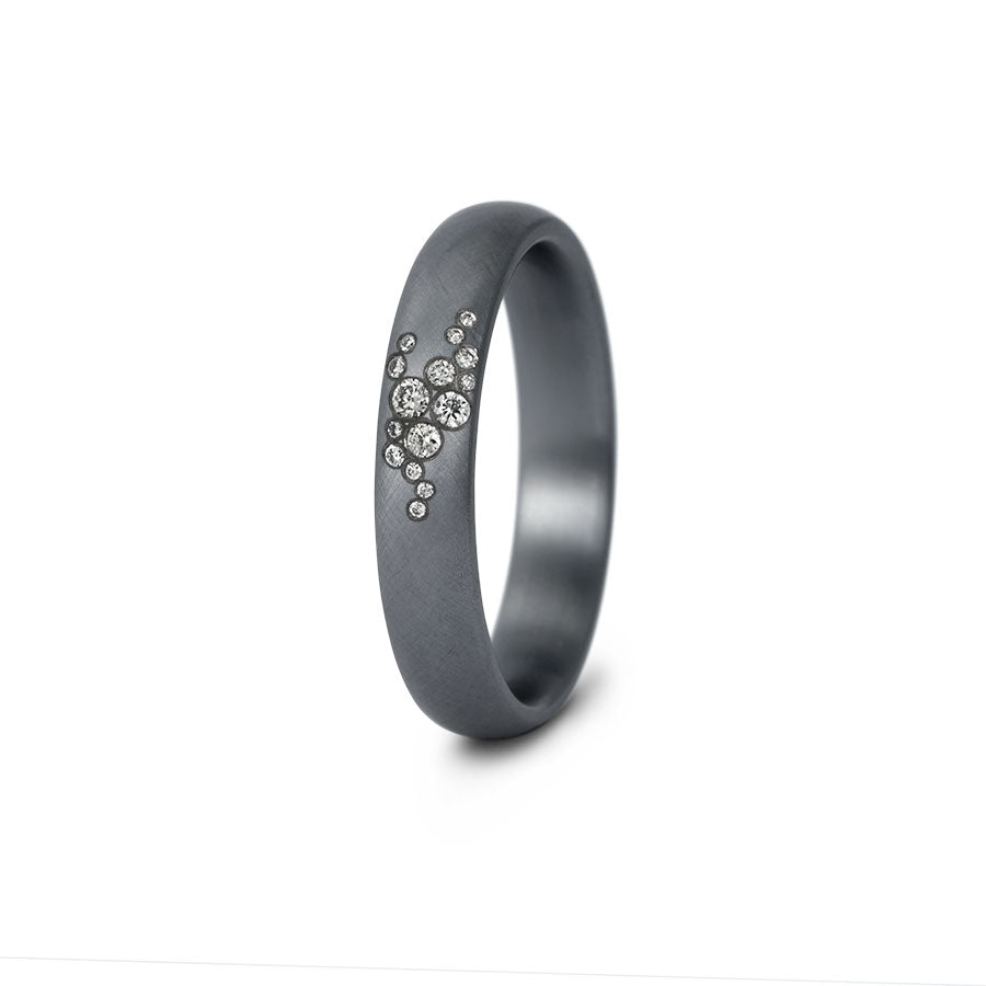 Dieser einzelne Ring ist aus dem seltenen Edelmetall "Tantal", mit einer mattierten Oberfläche. Der Ring gibt es mit/ohne Brillantbesatz. Wähle Sie Ihre Diamanten für Ihren Ring selbst aus.