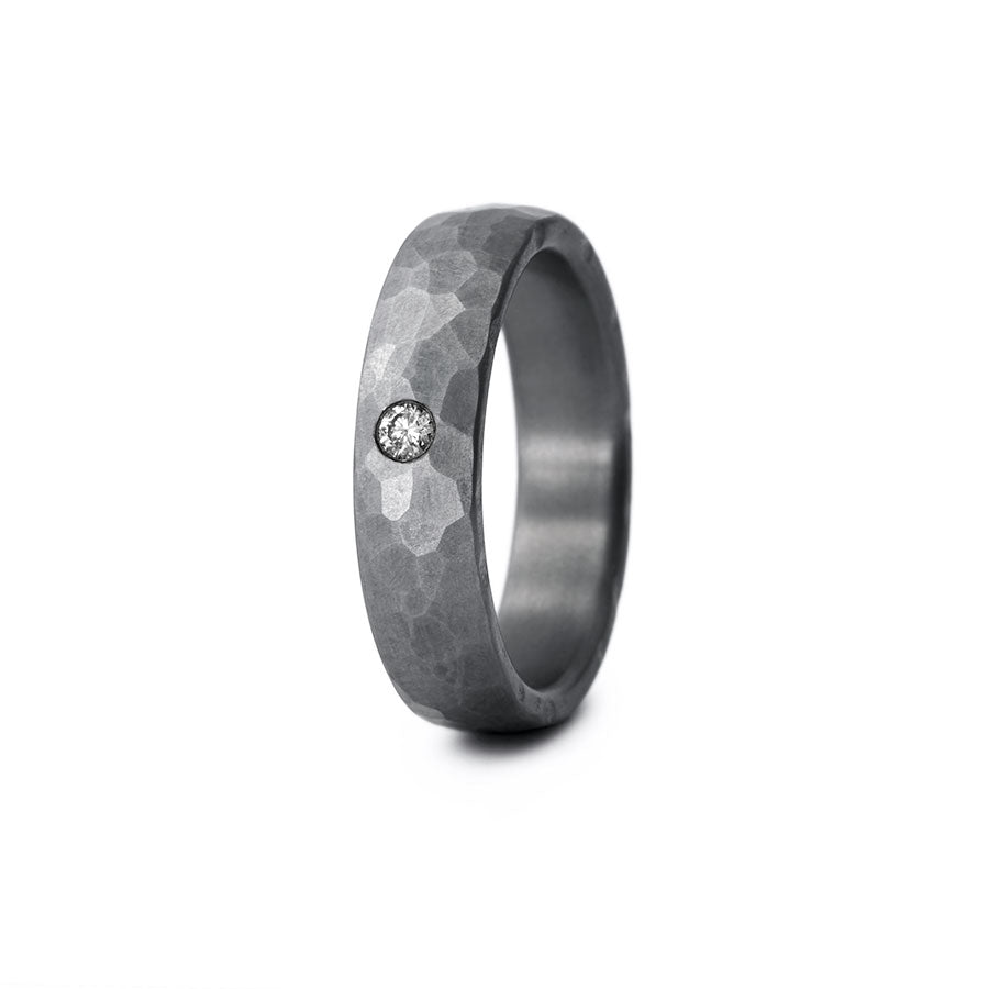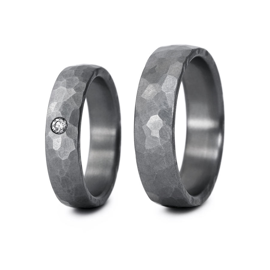 Tantal Eheringe Hammerschlag sind hochwertige Trauringe aus Tantal aus dem Hause Haudarin. Die Ringe haben eine angenehme Breite von ca. 5,0 mm. Der Damenring ist mit funkelnden Brillanten besetzt, die zusammen etwa 0,05ct ergeben.
