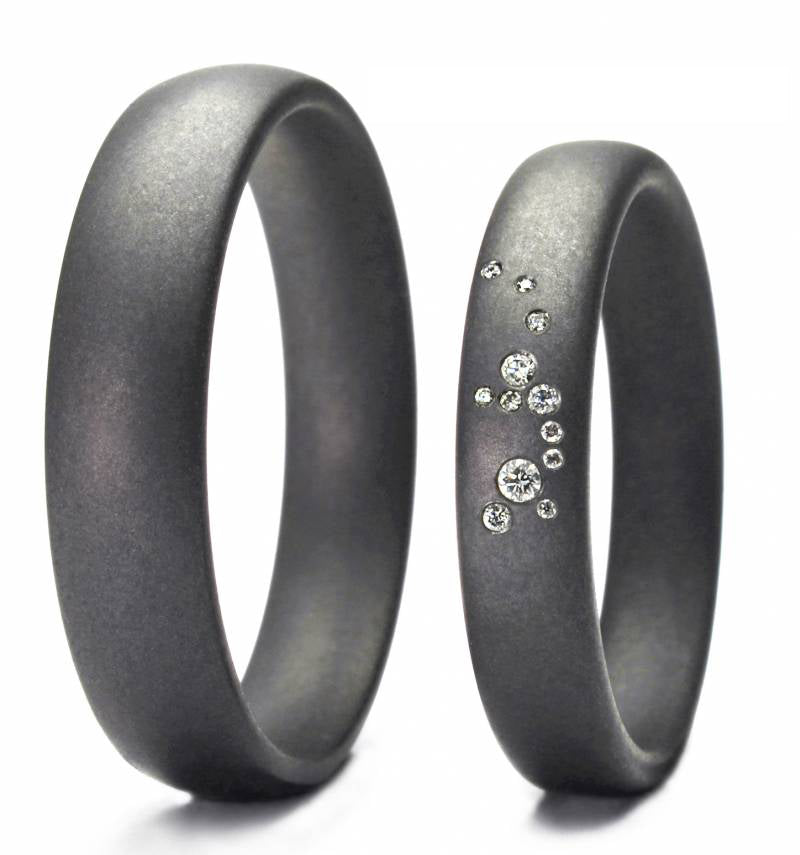 Die edel schimmernde dunkle und seidenmatte Oberfläche dieser minimalistisch geformten 4 beziehungsweise 5 mm breiten Eheringe aus kostbaren Tantal des Trauringhauses Tantalum Magic begeistert nicht nur Puristen.