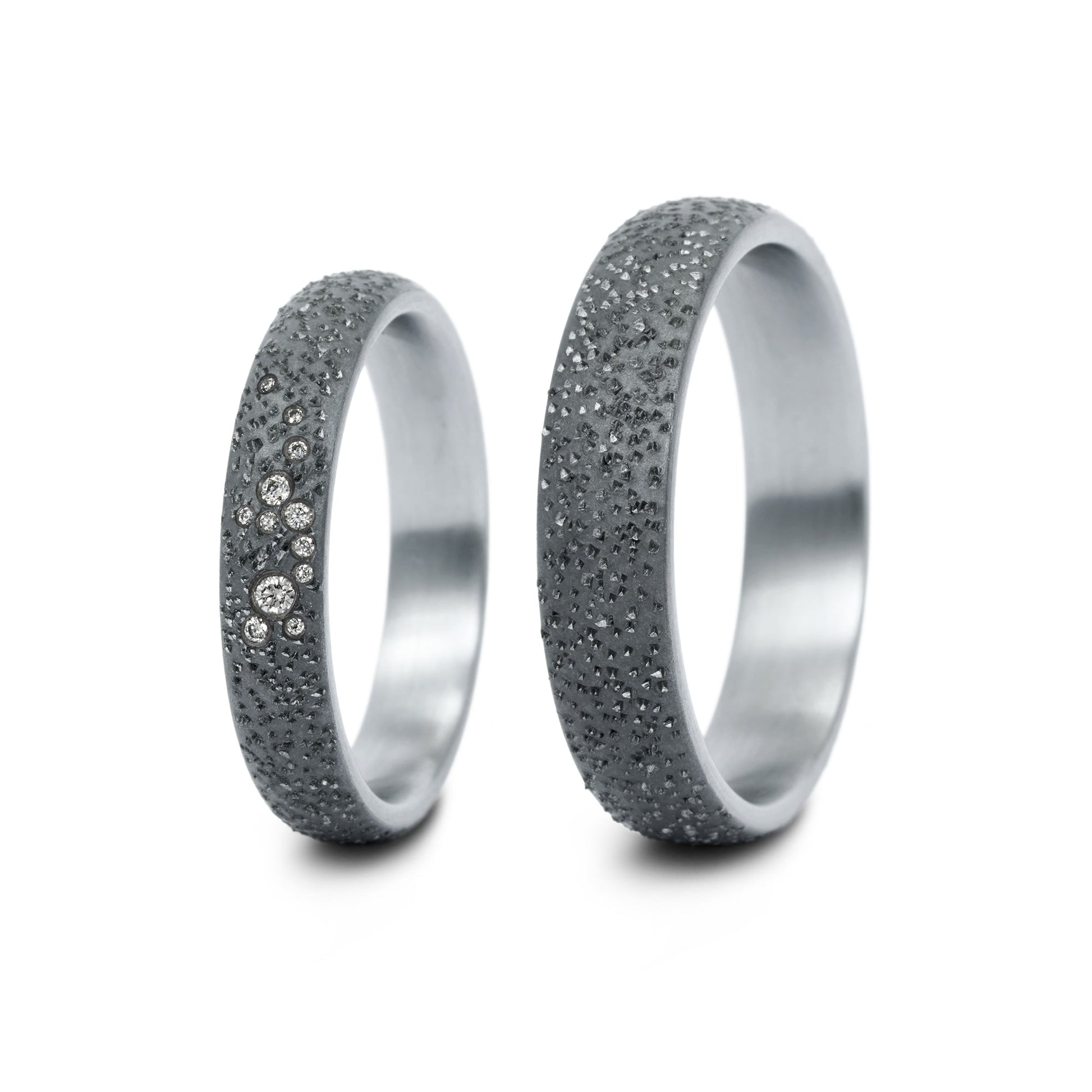 Die zurückhaltend schimmernde dunkle und seidenmatte Oberfläche dieser klassisch geformten 4 beziehungsweise 5 mm breiten Eheringe aus Herzklopfen verursachenden Tantal begeistert. Der leicht gewölbte Rücken der Ringe geht in weich gezeichnete Ränder über. Die 12 kleinen und noblen Steine haben insgesamt 0,043 Karat.