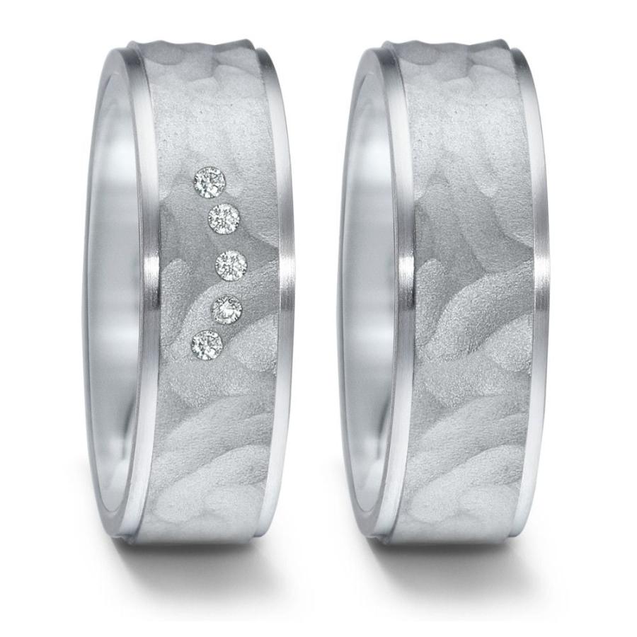 Eigenschaften:Rund 1 mm breit und glänzend poliert sind die beidseitigen Flanken und die Stirnseiten dieser 7.0 mm breiten Eheringe. Nach den Flanken kommt eine leicht erhabene, breite und zentrale, Straße mit einem strukturierten und mattierten Belag der an Hammerschlag erinnert. Die edlen Kunstwerke aus Tantal wurden von den Goldschmiedemeistern des Hauses TitanFactory mit Hingabe gefertigt. Besonders viel Zuwendung erhält der Brautring Ihrer besseren Hälfte. Sichelförmig ist in der Ringmitte, der Länge nach, eine Sichel aus fünf strahlenden Brillanten gezeichnet. Die eingeriebenen Steine haben insgesamt 0,05 Karat. Die Ringe sind auch einzeln oder ohne Brillanten bestellbar. Bitte senden Sie uns bei Fragen eine Email.