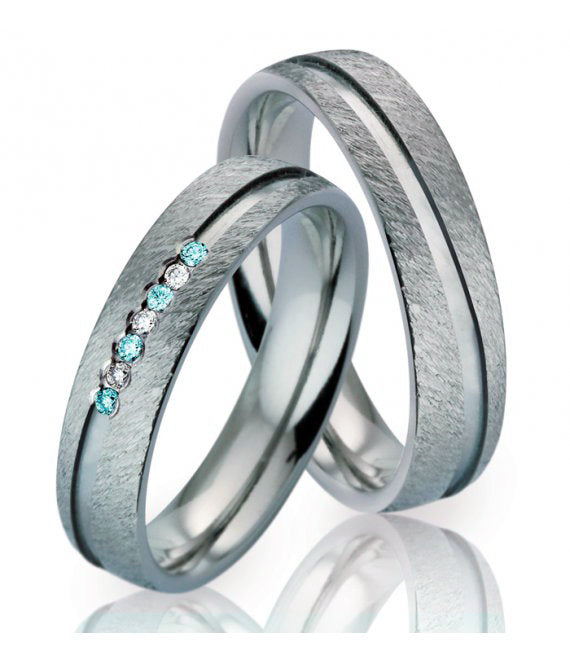 Eigenschaften:Attraktives Titan Ringpaar aus der Ocean Blue Serie von TitanFactory in 6.0 mm breite. Der Damenring besitzt 7 blaue/Weiße Diamanten mit 0,07 ct Die Designer aus dem Haus TitanFactory haben mit diesen Titanringen wieder einen großen Wurf gelandet. Die 6.0 mm breiten Ringe mit der eismatten Oberfläche sind eine Augenweide. Ausdrucksstark wartet der Trauring Ihrer zukünftigen Gattin auf. Hier verläuft eine kräftige diagonale Rille, die glänzend poliert ist. In der Rille sind sieben strahlend Weiße Diamanten positioniert. Magische Eheringe für eine Zauberhafte Zukunft. Die Ringe sind auch einzeln oder ohne Brillanten bestellbar. Bitte senden Sie uns hierfür eine Email.